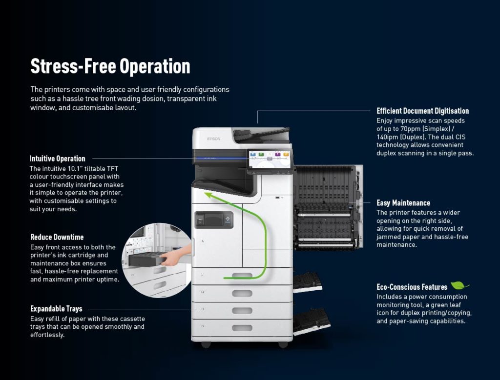 Dirancang untuk memberikan keunggulan, printer Epson WorkForce Enterprise hadir dengan Teknologi Bebas Panas, menawarkan pencetakan super cepat yang konsisten dan andal dengan konsumsi daya hingga 85% lebih hemat* dibandingkan printer laser. Sempurna untuk kantor kecil yang memerlukan kecepatan cetak 55 ppm, printer inkjet bisnis yang ramah lingkungan ini membantu mengurangi biaya operasional berkat lebih sedikit komponen dan bahan habis pakai. Dengan produktivitas tinggi serta pilihan dan solusi penyelesaian terbaru, printer bisnis multifungsi ini menawarkan skalabilitas luar biasa untuk mendukung pertumbuhan bisnis Anda.