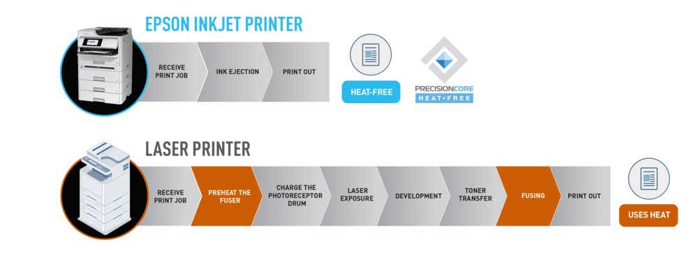 Inkjet printers use lower power consumption, fewer replacement parts, and fewer consumables than comparable Laser printers, thereby reducing environmental impact.